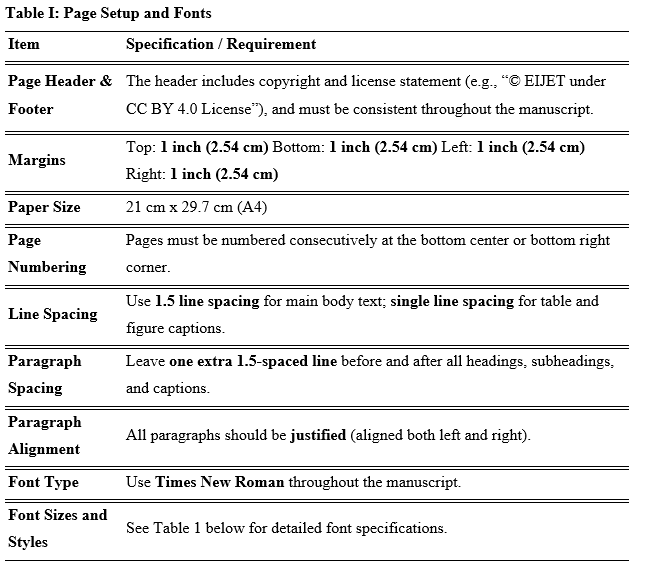 Attribution Requirements: When reusing any portion of a “Work”, the author must attribute the authorship to the original author(s) and cite EIJET as the source of publication. The specific attribution format required by CC BY 4.0 can be found in the license itself on the Creative Commons Website.