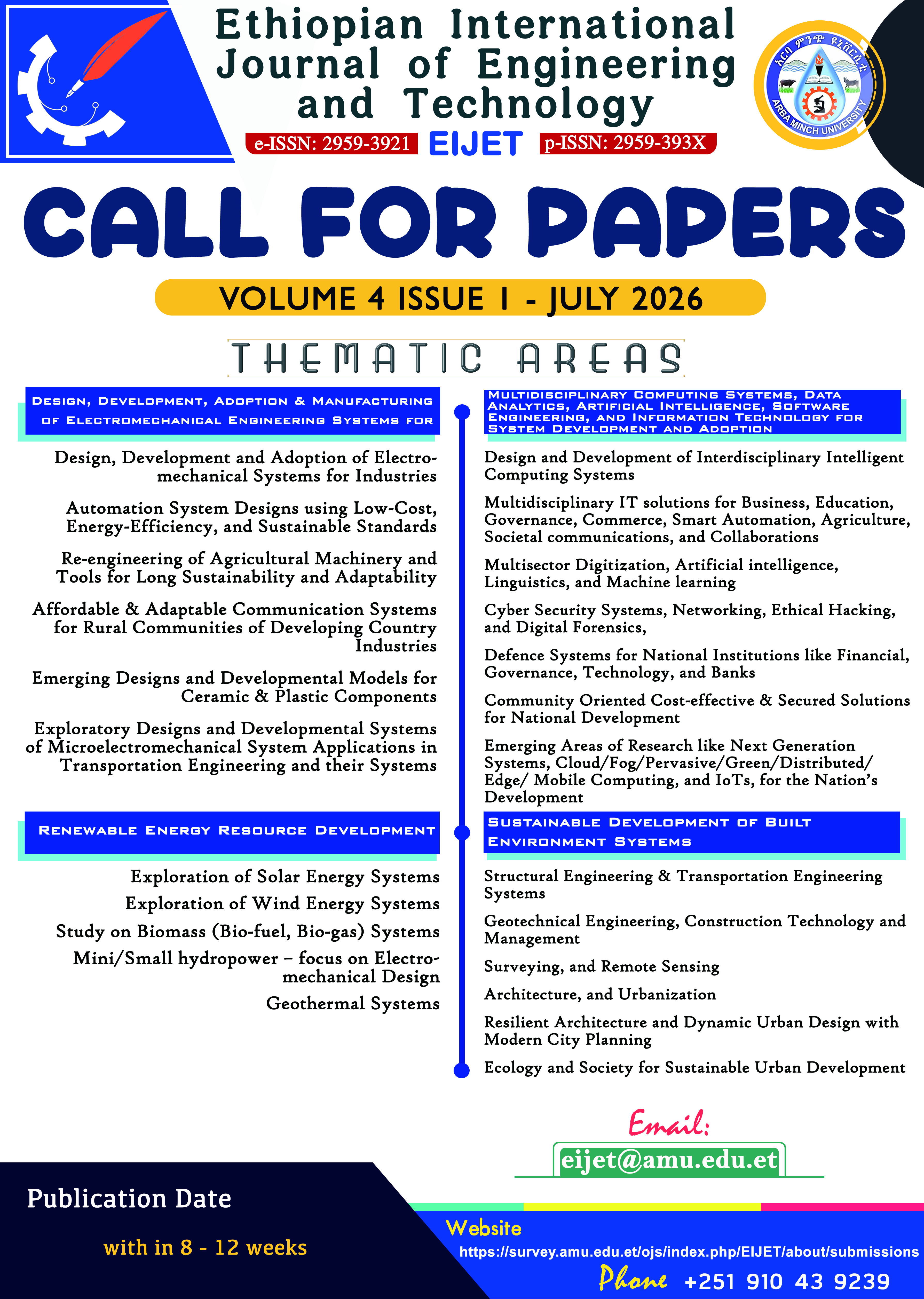 We cordially invite you to submit your manuscript for consideration in the Ethiopian International Journal of Engineering and Technology (EIJET), a peer-reviewed and Google Scholar-indexed journal. This upcoming issue (EIJET Vol. 4, Issue 1) seeks original research contributions across various engineering and technology disciplines, including: